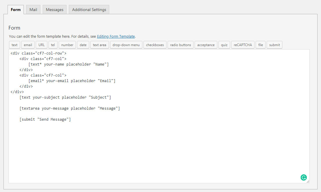 1 2 3 4 5 6 7 8 9 10 11 12 13 14 15 16 17 18 19 | <a class="btn btn-sm btn-purple clipboard-copy" data-original-title="Copied!">Copy</a><span class="language-name"></span><div class="cf7-col-row"> <div class="cf7-col"> [text* first-name placeholder "First name"] </div> <div class="cf7-col"> [text* last-name placeholder "Last name"] </div></div><div class="cf7-col-row"> <div class="cf7-col"> [email* your-email placeholder "Your email"] </div> <div class="cf7-col"> [text phone-number placeholder "Phone Number"] </div></div> [textarea* message placeholder "Mes |