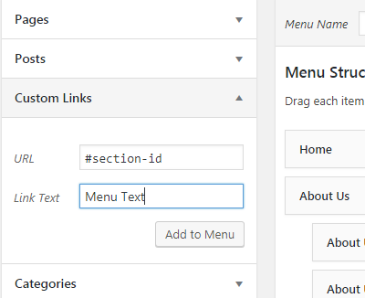 For One Page Menu you need to use custom links option to make one page menu. Put your section ID in the URL field and menu text goes Link Text field. Then hit Add to Menu Button.
