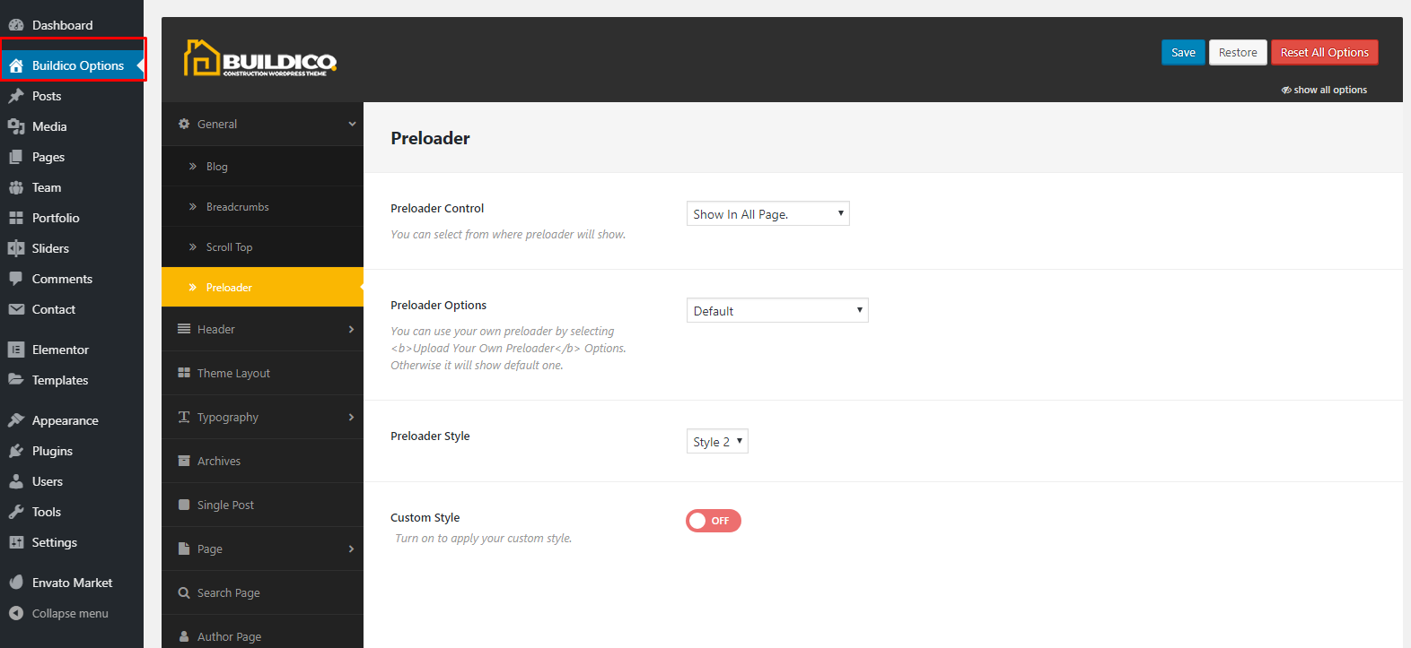 Navigate to Dashboard → Appearance → Buildico Options :