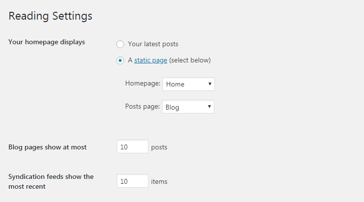 "Front Page"and which page you want as“blog posts”page. Default Front Page is‘Home’and default posts page is‘Blog’.